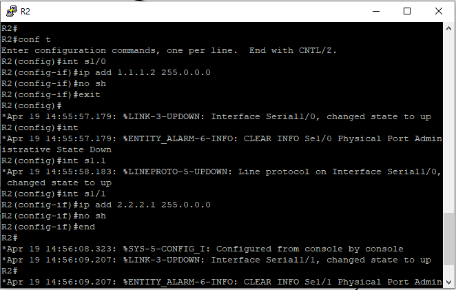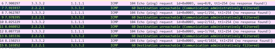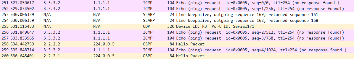 R4에서 시도해본결과 핑이 가지 않았고 IP Address가 2.2.2.2인 R3에서 Ping을 보냈을 때의 결과 값이다.