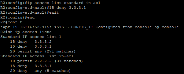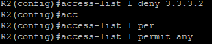 access-list 1 deny 3.3.3.2 : Deny는 특정 IP Address에 대한 접근을 거부하는 규칙을 추가한다는 뜻이므로 3.3.3.2에 대해 접근을 거부한다.