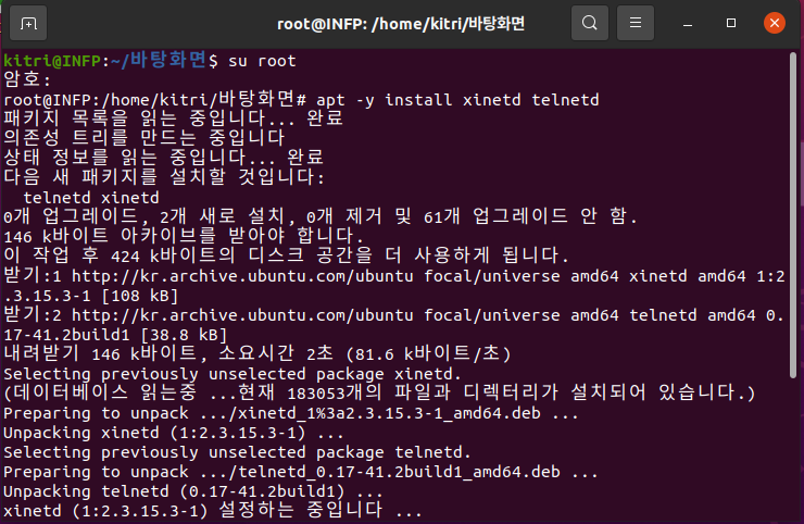 1. apt -y install xinetd telnetd 명령으로 관련 패키지를 다운