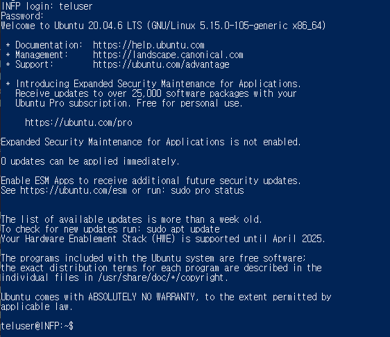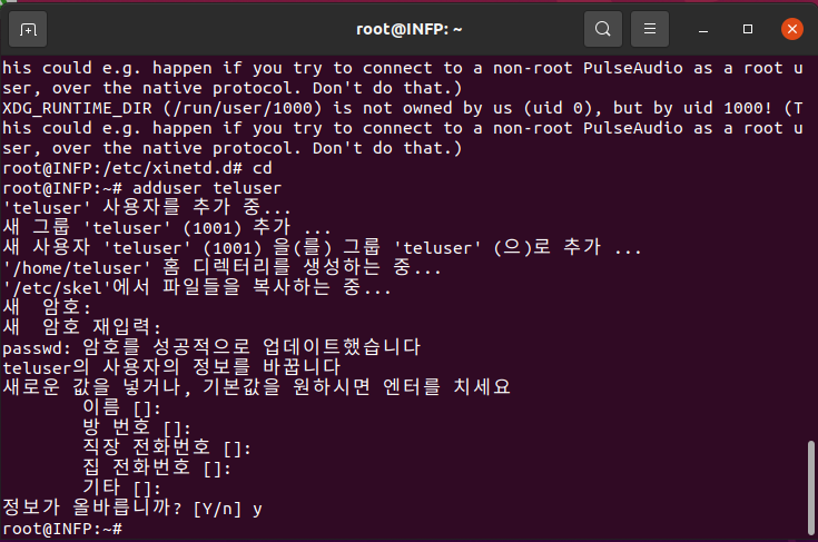 4. adduser teluser 명령을 입력해 접속 테스트를 위한 사용자를 만들고, 비밀번호는 1324로 설정
