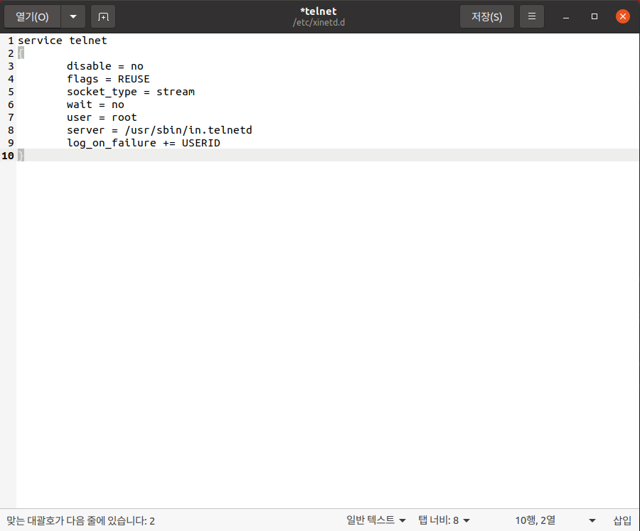 3. gedit로 telnet 파일을 열고 다음 내용을 입력후 저장