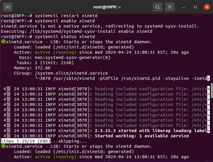 systemctl restart/enable/status xinetd 명령어를 사용해 시스템을 가동시킨다.