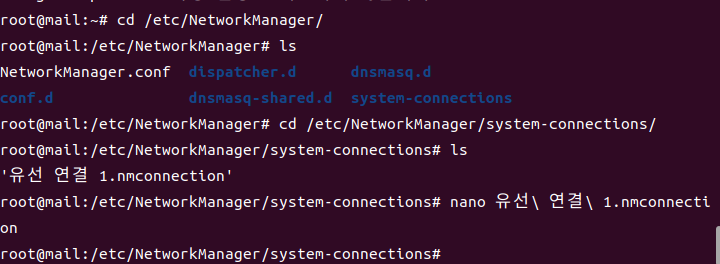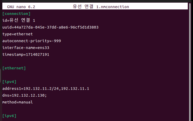 9. nano를 사용해 /etc/NetworkManager/system-connections/유선 연결 1.nmconnection 을 수정한다. (Name Server)