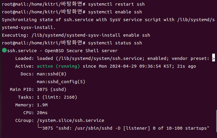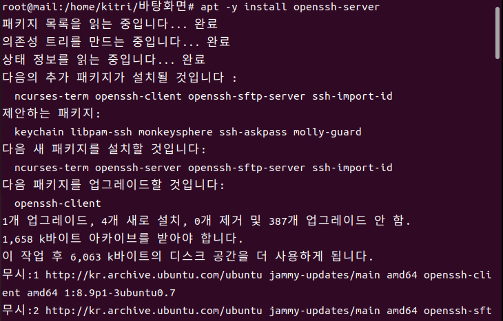 1. 'apt -y install openssh-server' 명령으로 SSH 서버를 설치
