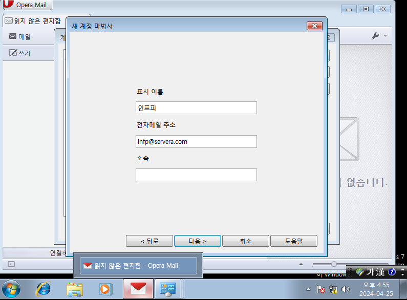 2. [표시 이름]은 필자는 '인프피' [전자메일 주소]는 'infp.servera.com'으로 입력하고 계속을 눌렀다.