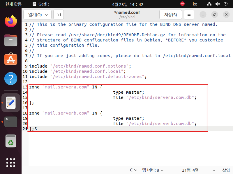 4. gedit /etc/bind/named.conf 파일을 열어 내용을 추가해준다. (Name Server)