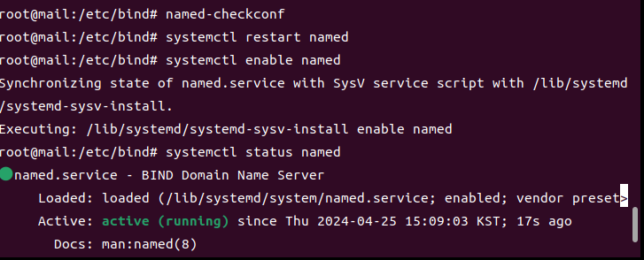systemctl restart/enable/status named 이후 ufw disable명령어로 방화벽을 중지시킨다.