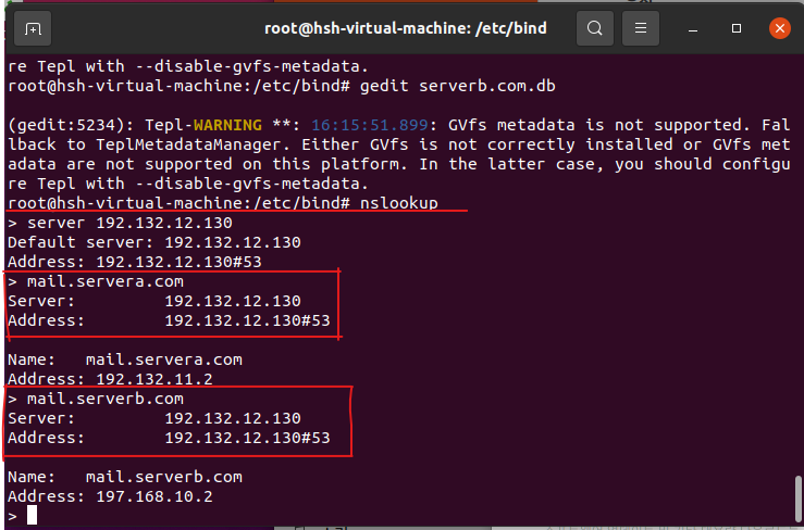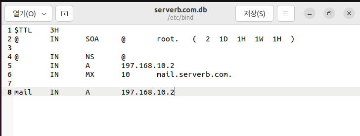 6. gedit servera.com.db 파일에 다음 내용을 추가한다. (Name Server)