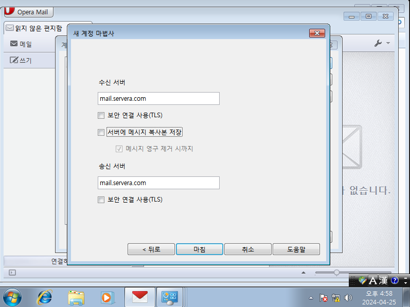 4. [수신 서버]와 [송신 서버]에 모두 'mail.servera.com'을 입력하고 <마침>을 클릭