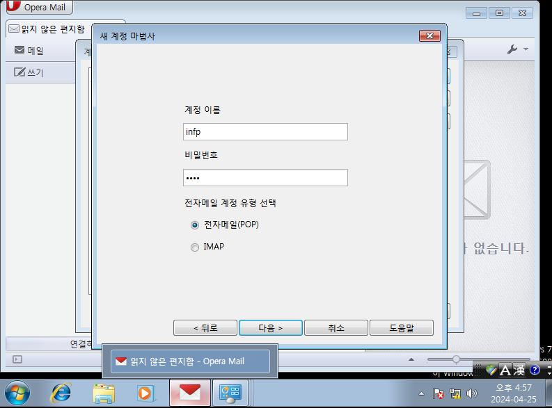 3. 비밀번호는 1324로 설정 전자메일(PoP) 선택 후 다음