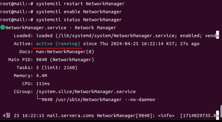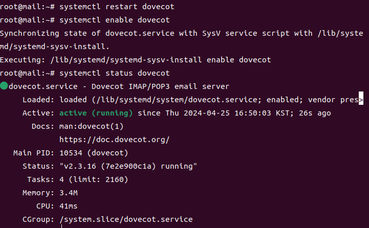 이후 systemctl 명령으로 sendmail 과 dovecot 를 실행한다.