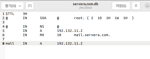 6. gedit servera.com.db 파일에 다음 내용을 추가한다. (Name Server)