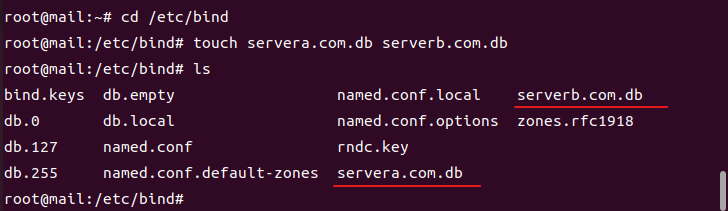 5. /etc/bind 디렉터리로 옮겨 servera.com.db 와 serverb.com.db 파일을 생성한다. (Name Server)