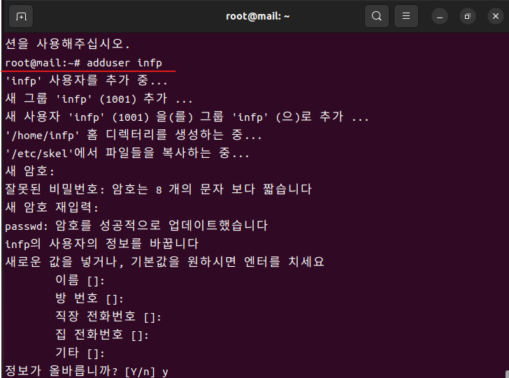 13. adduser 명령으로 메일 계정 사용자 infp를 생성했다. 비밀번호는 1324로 설정하였고 나머지는 기본값으로 설정