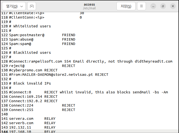 수정후 makemap hash /etc/mail/access 명령으로 적용한다.