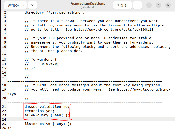 3. apt -y install bind9 bind9utils 명령으로 네임 서버 패키지를 설치 후 gedit /etc/bind/named.conf.options로 들어가 다음과 같이 내용을 수정 및 추가해준다. (Name Server)
