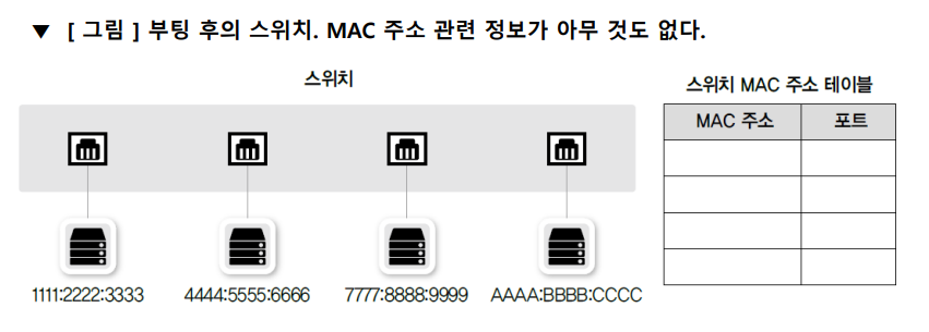 - 스위치는 LAN에서 동작하므로 자신이 정보를 갖고 있지 않더라도 어딘가에 장비가 있을 수 있다고 가정하고 이와 같은 작업을 수행함