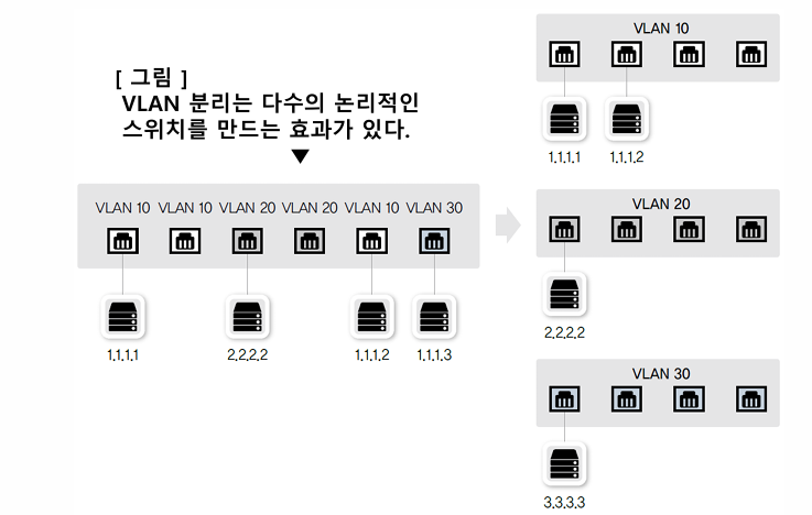 - VLAN으로 분할된 스위치는 물리적인 별도의 스위치처럼 취급
