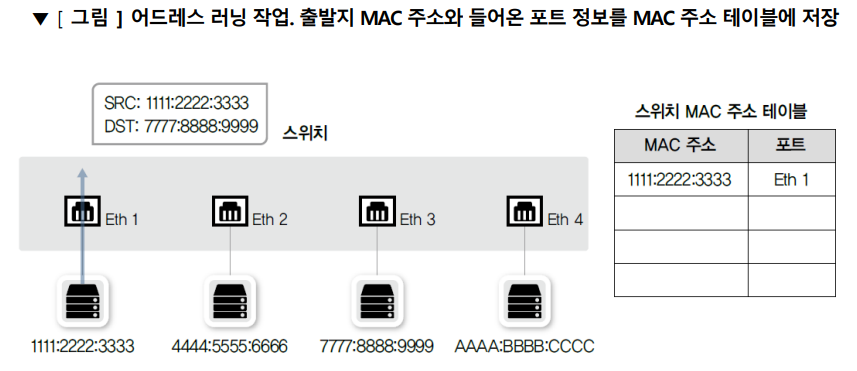 - 스위치가 패킷의 도착지 MAC Address를 확인하여 원하는 포트로 포워딩하는 스위치의 동작을 정상적으로 수행하려면 MAC Address 테이블을 만들고 유지해야 함