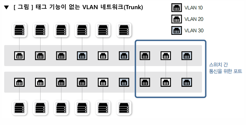 - 여러 개의 VLAN이 존재하는 상황에서 스위치를 서로 연결해야 하는 경우에는 각 VLAN끼리 통신하려면 VLAN의 개수만큼 포트를 연결해야 함