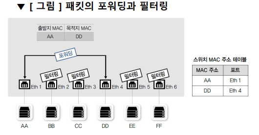 - 스위치는 이런 포워딩과 필터링을 통해 목적지로만 패킷이 전달되도록 동작