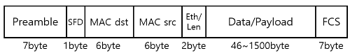 - Preamble: 수신측에 이더넷 프레임이 전송되었다는 것을 알림 (도착할 이더넷 프레임에서 0과 1을 구분할 수 있도록 동기신호 제공 역활 수행)