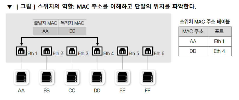 - 스위치는 네트워크 중간에서 패킷을 받아 필요한 곳에만 보내주는 중재자