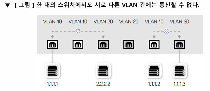 - VLAN이 다르면 별도의 분리된 스위치에 연결된 것과 같으므로 VLAN 간 통신이 불가능
