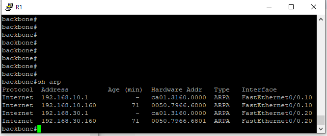 이후 아래 VPCS 1번엔 192.168.10.160 IP 주소를 넣어주고 2번엔 192.168.30.160 IP 주소를 넣어줬다. 이후 show arp 명령어를 통하여 두 PC가 연결되었는지 확인 한다.