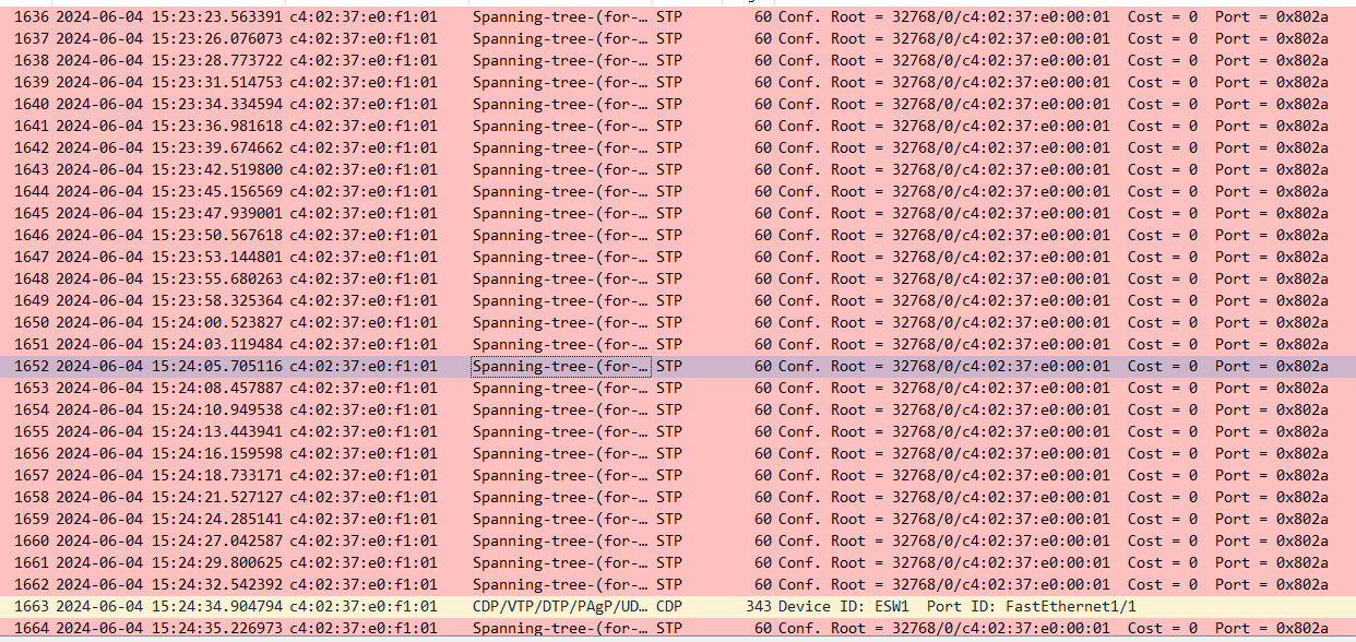 패킷을 보면 STP 패킷이 나오는걸 확인할 수 있다. STP(Spanning Tree Protocol) 패킷은 네트워크에서 루프를 방지하기 위해 사용되는 프로토콜이다. STP는 스위치 네트워크에서 일어날 수 있는 루프를 감지하고 차단하여 네트워크가 안정적으로 동작하도록 만든다.