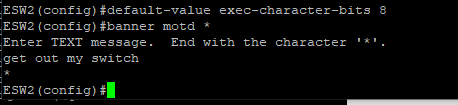 banner motd * 명령어를 사용하면 경고 메시지 설정을 할 수있다. 별표(*)는 메시지 입력이 끝났음을 표시한다.