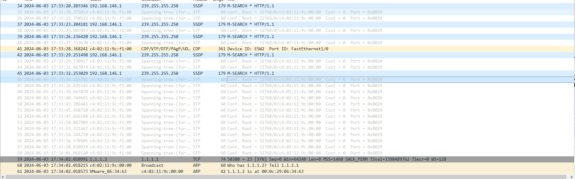 패킷을 보면 STP 패킷이 나오는걸 확인할 수 있다. STP(Spanning Tree Protocol) 패킷은 네트워크에서 루프를 방지하기 위해 사용되는 프로토콜이다. STP는 스위치 네트워크에서 일어날 수 있는 루프를 감지하고 차단하여 네트워크가 안정적으로 동작하도록 만든다.