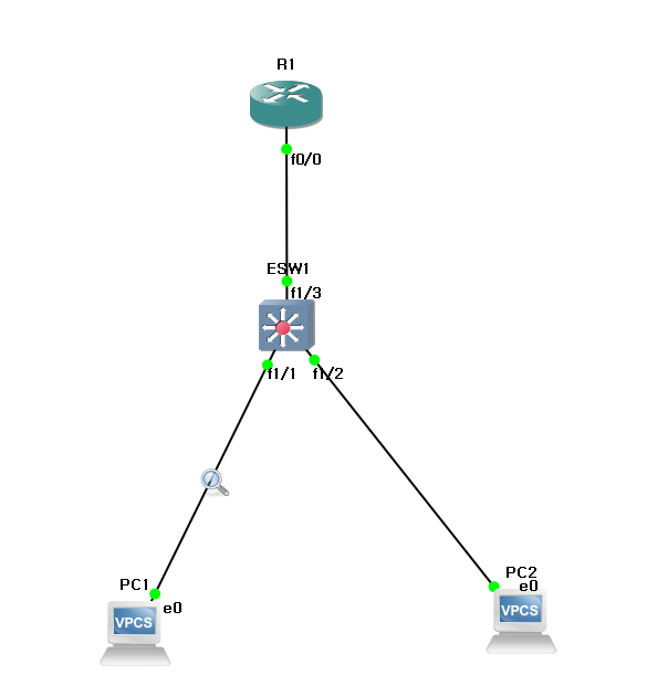 토폴로지는 아래와 같이 생성하였고, 아래의 두개의 PC에 VLAN을 만들어 서로 통신이 되는지를 확인한다.