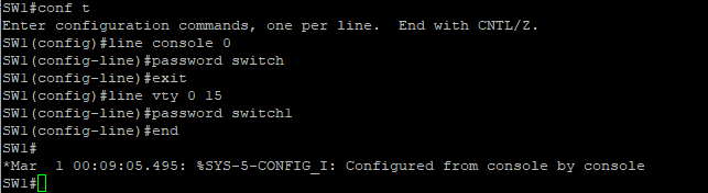 출력 결과에서 VTY 라고 표시된 것들이 텔넷으로 접속할 수 있는 가상 포트 번호이다. VTY 번호가 1 ~16 까지이므로 텔넷으로 동시 접속 가능한 수는 16이다. 텔넷 가상 포트에 모두 패스워드를 설정하려면 다음처럼 line vty 명령어 이후 0 ~ 15까지의 번호를 지정하면 된다. (스위치 모델에 따라 다를 수 있음) 텔넷에 패스워드 설정을 하려면 password 명령어 사용
