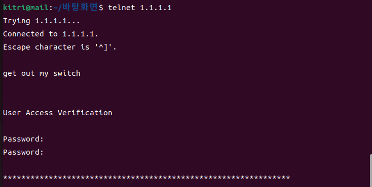 banner motd * 명령어를 사용하면 경고 메시지 설정을 할 수있다. 별표(*)는 메시지 입력이 끝났음을 표시한다.