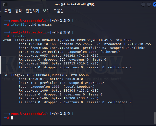 1. ifconfig eth0 promisc 명령어를 통해 네트워크 인터페이스의 현재 상태와 설정을 확인할 수 있다. 네트워크 인터페이스를 혼잡 모드로 설정한 후 ifconfig 명령어를 사용하여 해당 설정이 적용되었는지 확인할 수 있다.