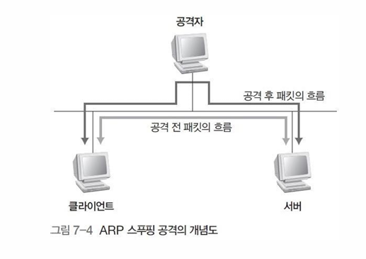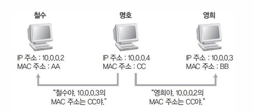 - ARP 스푸핑에 대한 이해 : MAC 주소를 속이는 것(2Layer에서 작동해 공격 대상이 같은 랜에 존재해야함)