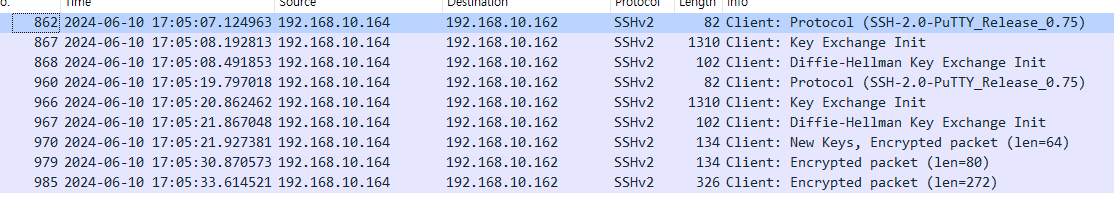 이후 위와 같이 fragrouter -B1 명령어를 적용하고, ssh로 Server와 Client를 서로 연결해보자. 아래는 ssh로 붙는 과정의 패킷을 감청한것이다.
