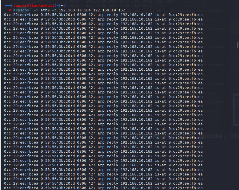 192.168.10.164(client)가 192.168.10.168(Attacker)를 192.168.10.162(Server)로 인식하도록 만들었다. 명령어를 보자면 arpspoof - i eth0 -t [공격대상IP] [인식시킬 IP]