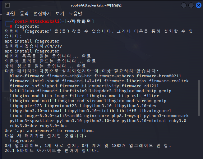- fragrouter: apt install fragrouter 명령어로 설치 가능