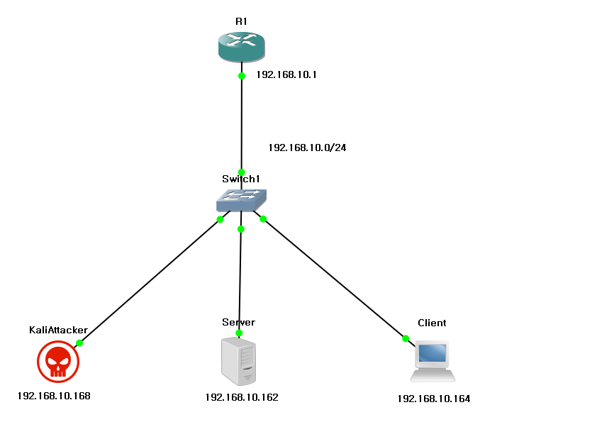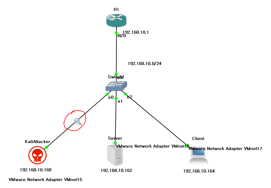 - 공격 후 패킷을 보기위해 간단한 토폴로지로 구성