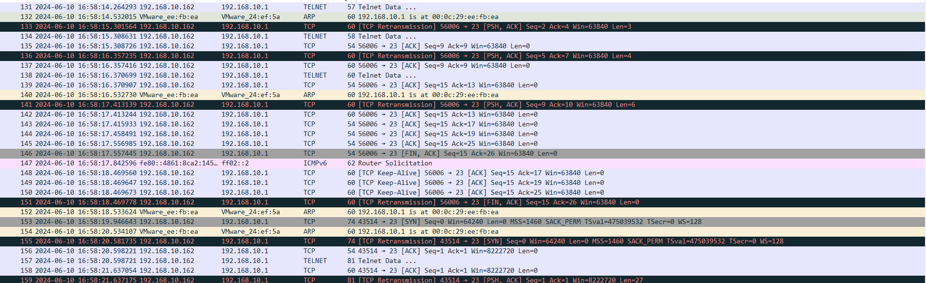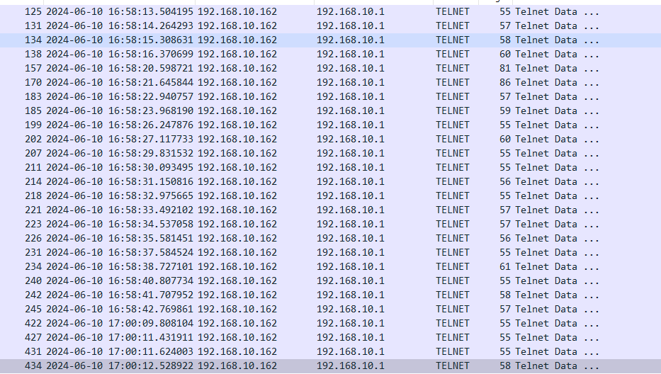 텔넷으로 붙는것 까지 공격자가 볼 수 있다. 아래 telnet 패킷을 보면 서로 통신하는것을 볼 수 있다.