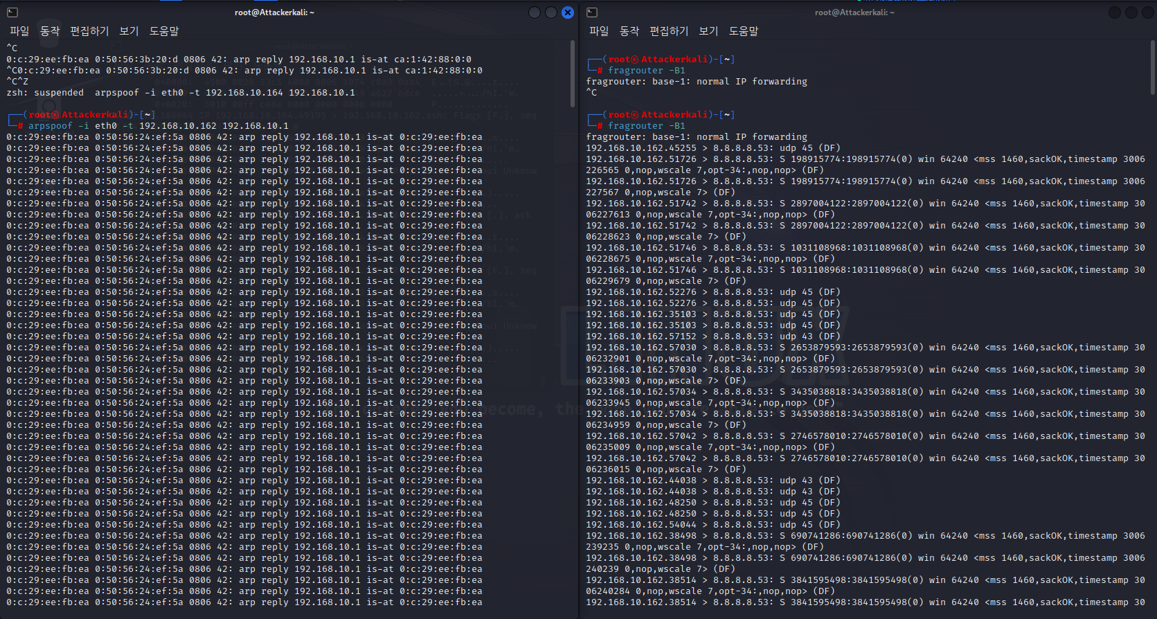 2. 이후 터미널을 두개 켜서 하나는 arpspoof - i eth0 -t [공격대상IP] [인식시킬 IP] 명령어를 사용해 공격하고, 다른 터미널에선 fragrouter -B1 명령어를 사용해 중간에서 패킷을 빼가겠다고 선언한다. 필자는 window client에 공격을 해보았다.