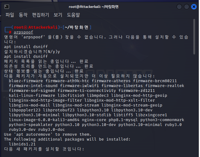 - arpspoof: apt install dsniff 명령어로 다운로드 가능