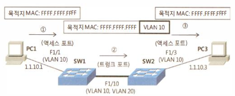 - 브로드캐스트 프레임을 수신한 스위치는 이 프레임이 속하는 VLAN 번호를 알아야 해당 VLAN에 소속된 모든 포트로 플러딩 시킬 수 있다.