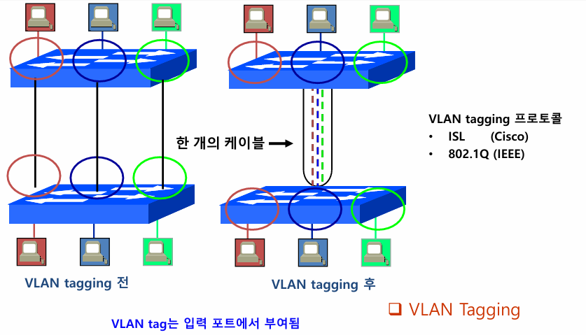 - 트렁크 포트로 연결된 스위치들간에 프레임을 전송할 때에는 VLAN 번호를 알려주어야함