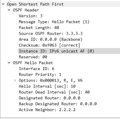 패킷은 아래와 같이 나왔다. 특징을 살펴보자면 IPv4에서는 OSPF가 v2를 사용하는것을 확인할 수 있었는데, IPv6에서는 v3를 사용하는것을 알 수있다.