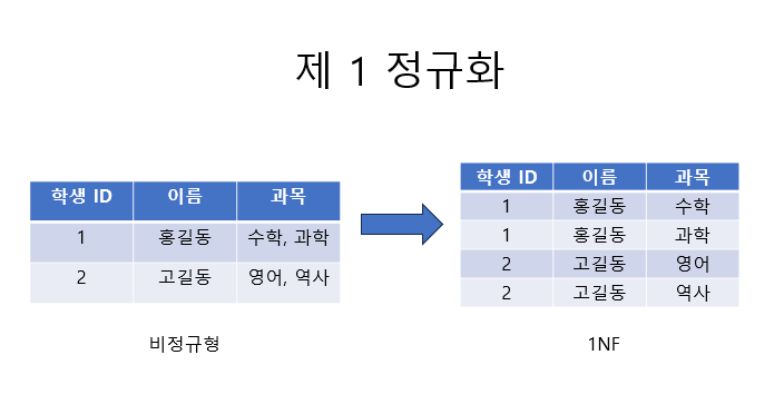 - 테이블의 각 열이 원자값 (Atomic value)을 가져야 한다는 규칙을 따름