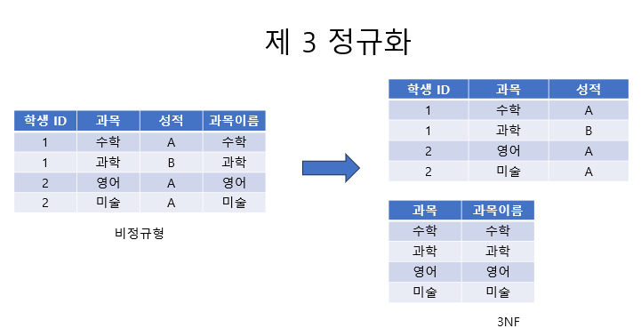 - 비기본키 속성이 다른 비기본키 속성에 *이행적 함수 종속이 없어야 한다는 규칙을 따름